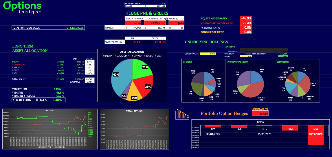 The important bit: equity hedge ratio went from under 10% last week to roughly 47% now. Actively rolling, replenishing, getting more defensive as we climb.