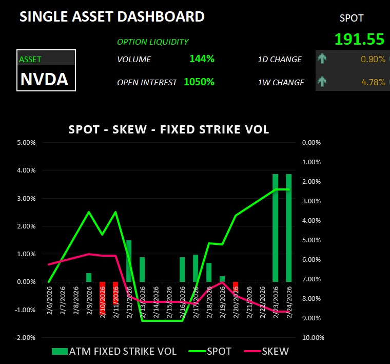 Price rising, skew steepening — puts getting bid while the stock sits at highs — the market is buying insurance against a move it doesn't trust. Disconfirmation.
