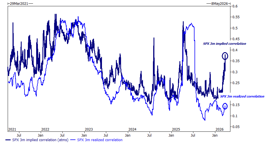 Fear. That's it. The geopolitical premium is getting dumped onto index options because that's the easiest way to hedge. Buy SPX puts, buy VIX calls, push index vol higher. But the single stock world is telling a completely different story. Dispersion is alive and well down there.