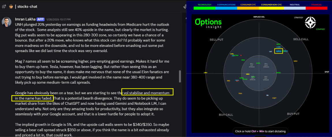 Below a sample from my daily single stock compass where we saw momentum fading and vol compressing in $GOOGL.
