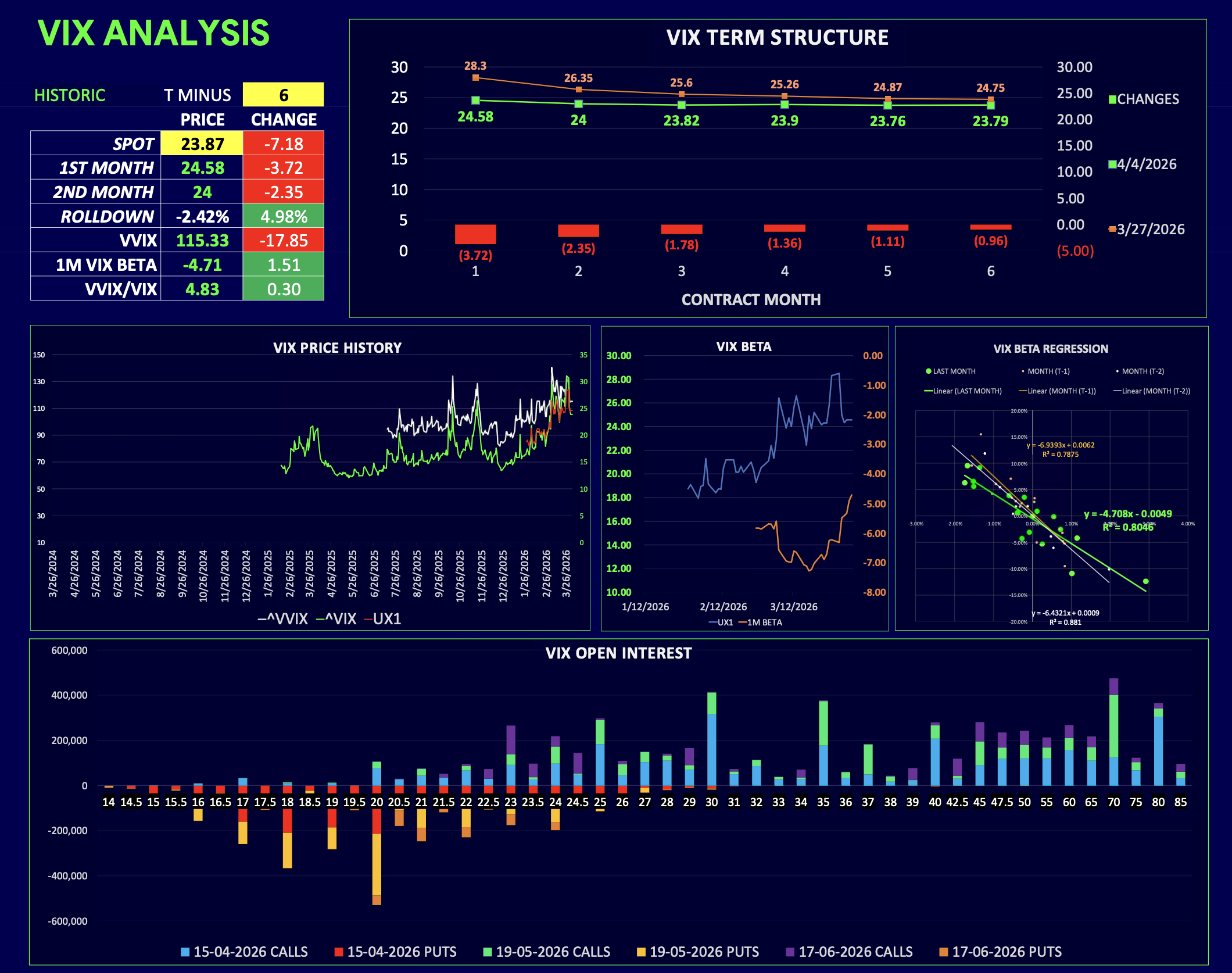 Look at VIX beta. It's sitting at -4.7 right now. A month ago it was much higher. That means the sensitivity of VIX to S&P moves is fading, even though VIX is still parked near 25.