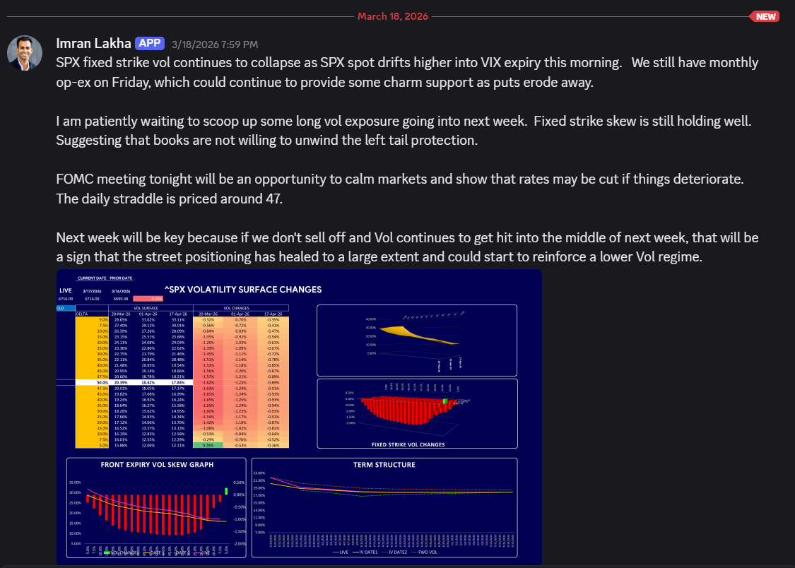 In my experience, fixed strike vol rolling over while spot makes new lows has been one of the most reliable exhaustion signals I track. It often calls the turn before price does.